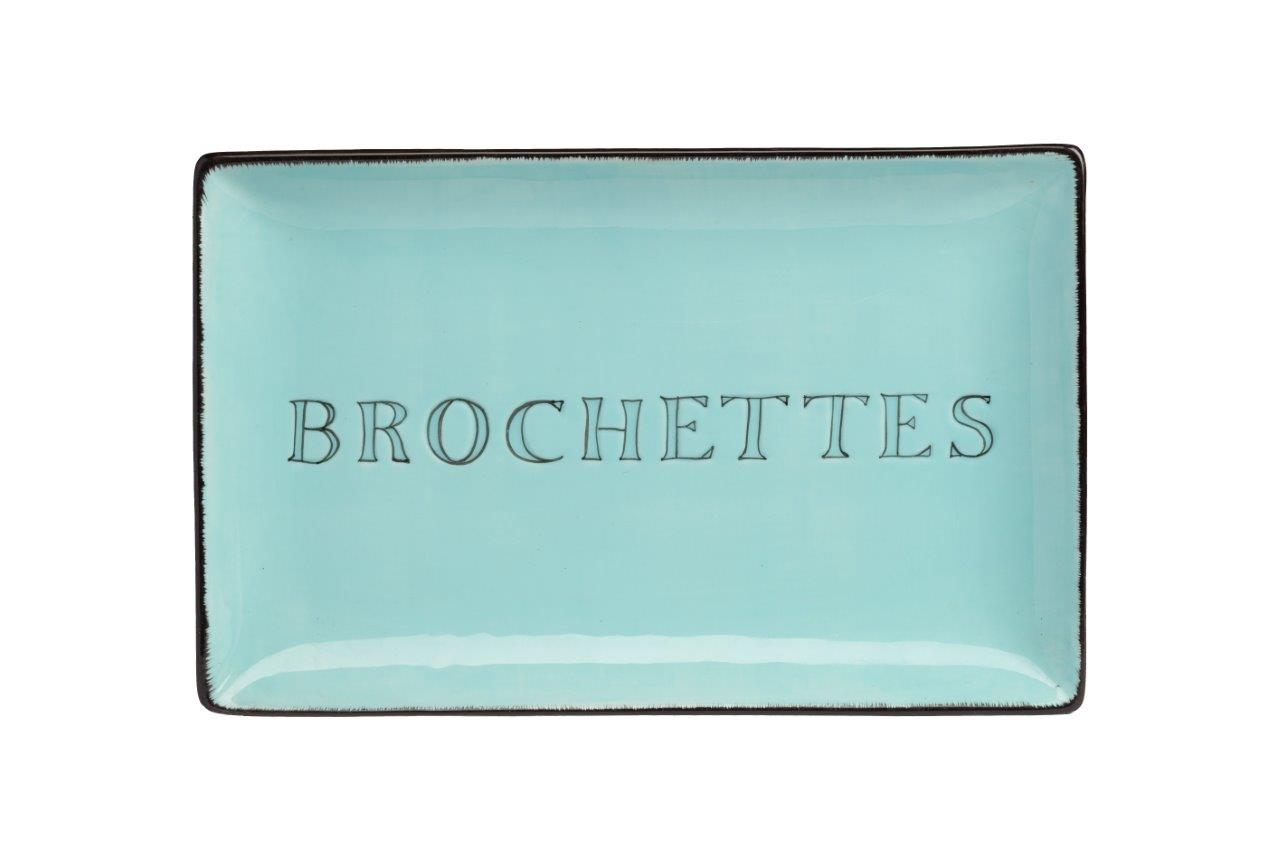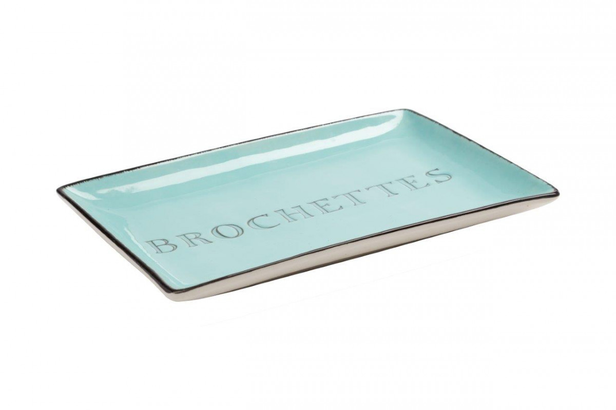 Декоративное блюдо Brochettes голубое прямоугольной формы изготовлено из керамики. Внутренняя поверхность окрашена в голубой цвет с надписью Brochettes, края блюда окантованы каймой чёрного цвета. Изысканный контраст цветов придаёт блюду современный вид. Подойдёт для нарезок, заливного.