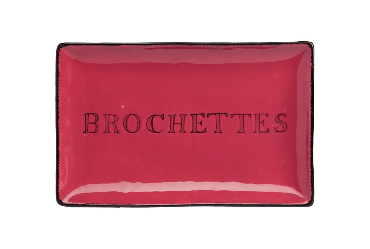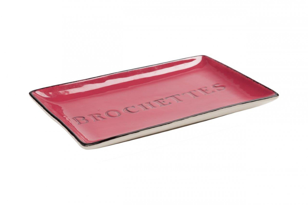 Декоративное блюдо Brochettes розовое прямоугольной формы изготовлено из керамики. Внутренняя поверхность окрашена в розовый цвет с надписью Brochettes, края блюда окантованы каймой чёрного цвета. Изысканный контраст цветов придаёт блюду современный вид. Подойдёт для нарезок, заливных блюд. Изысканно впишется в сервировку стола.
