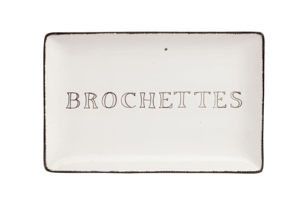 Декоративное блюдо Brochettes белое прямоугольной формы изготовлено из керамики. Все блюдо декорировано в белом цвете с надписью Brochette, края блюда окантованы каймой чёрного цвета. Изготовлено в стиле Прованс. В комбинации с другими столовыми предметами создаст уникальную сервировку стола.